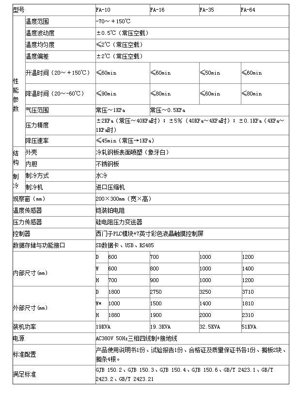 fa系列 高低溫低氣壓試驗箱適用于對材料類、電工電子類、軍工類等產(chǎn)品、零部件進行溫度、濕度、高度綜合試驗。