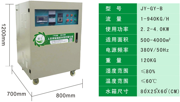 2、jy自動高壓噴霧加濕機(jī)組噴嘴個數(shù)40~300,加濕量140~1050kg/h,加濕空間1500~60000m3多種規(guī)格供您選擇。