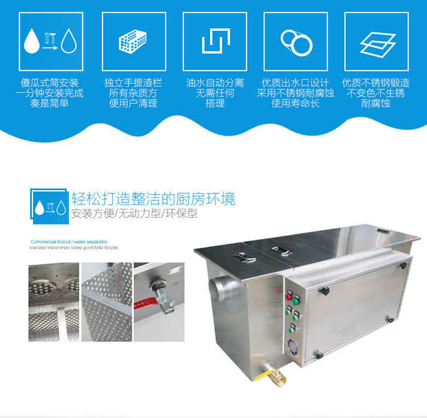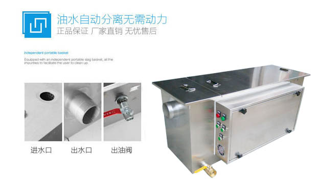 鐵山全自動(dòng)高效油水分離器隔油池隔油器是采用最新技術(shù)重力法、生化法和機(jī)械縫隙過(guò)濾相結(jié)合,將含油污水中的渣、油水自動(dòng)分離的新一代環(huán)保產(chǎn)品。在工藝原理和結(jié)構(gòu)設(shè)計(jì)上均有不少獨(dú)到之處,因而產(chǎn)品工作可靠,使用安 全,維護(hù)保養(yǎng)簡(jiǎn)便,加之體積小,能耗低,使用壽命極長(zhǎng),不需添加任何試劑 和藥品,無(wú)二次污染。它根據(jù)水和油脂的不同介電常數(shù),采用了獨(dú)特的工藝原理和設(shè)備結(jié)構(gòu),使用rf技術(shù),自動(dòng)將廢水中的油脂分離出來(lái),是目前國(guó)內(nèi)先進(jìn)理想的油水分離產(chǎn)品。