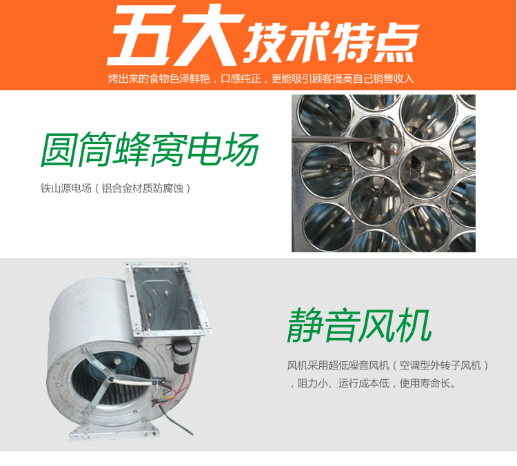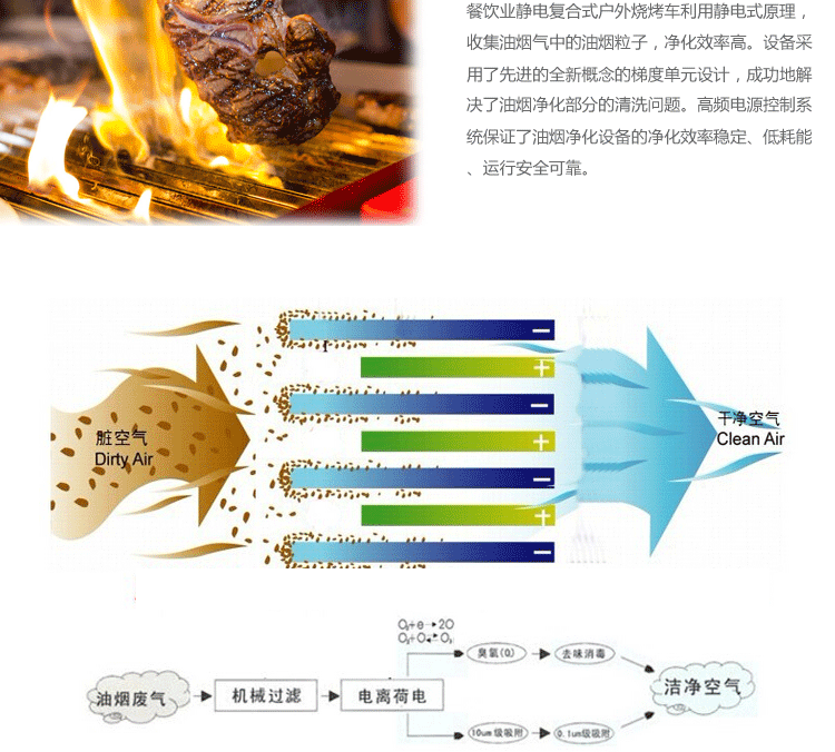 餐飲業(yè)靜電復(fù)合式戶(hù)外燒烤車(chē)?yán)渺o電式原理,收集油煙氣中的油煙粒子,凈化效率高。設(shè)備經(jīng)專(zhuān)業(yè)除塵設(shè)備檢測(cè)中心檢測(cè),依照國(guó)家環(huán)?偩肿钚掳l(fā)布的《飲食業(yè)油煙排放標(biāo)準(zhǔn)》中的采樣及分析方法測(cè)定,設(shè)備的油煙及異味凈化效率平均達(dá)到85%以上。設(shè)備采用了先進(jìn)的全新概念的復(fù)合式過(guò)濾柵和高壓靜電設(shè)計(jì)。電源控制系統(tǒng)保證了油煙凈化設(shè)備的凈化效率穩(wěn)定、低耗能、運(yùn)行安 全可靠、全國(guó)許多地區(qū)已有實(shí)際應(yīng)用,效果顯著,得到用戶(hù)的一致好評(píng)。