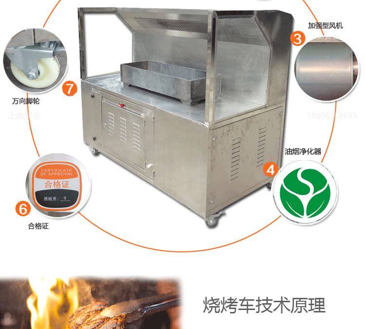 燒烤車(chē)是專(zhuān)為碳烤食品設(shè)計(jì)生產(chǎn)的一種新型環(huán)保油煙凈化裝置,可移動(dòng)燒烤,使用方便、易維護(hù);全機(jī)體磨沙靜電噴塑,外型美觀;適用非常廣泛:賓館、飯店、餐廳、超市、酒巴、廟會(huì)、快餐食品店、夏日啤酒廣場(chǎng)、住宅區(qū)餐飲等場(chǎng)所的碳烤串及油炸、鐵板扒爐食品的油煙凈化。