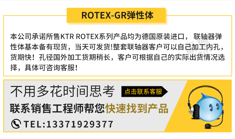 本公司承諾所售ktr rotex系列產(chǎn)品均為德國原裝進(jìn)口, 聯(lián)軸器彈性體基本備有現(xiàn)貨,當(dāng)天可發(fā)貨!整套聯(lián)軸器客戶可以自己加工內(nèi)孔,貨期快!孔徑國外加工貨期稍長,客戶可根據(jù)自己的實際出貨情況選擇,具體可咨詢客服!