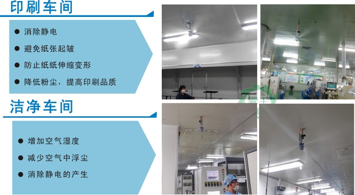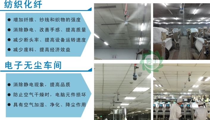 6、改善空氣質(zhì)量:噴霧加濕的同時(shí)降塵、降溫及增加空氣的負(fù)氧離子含量。