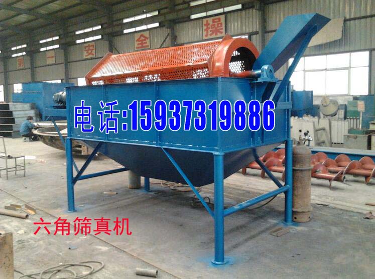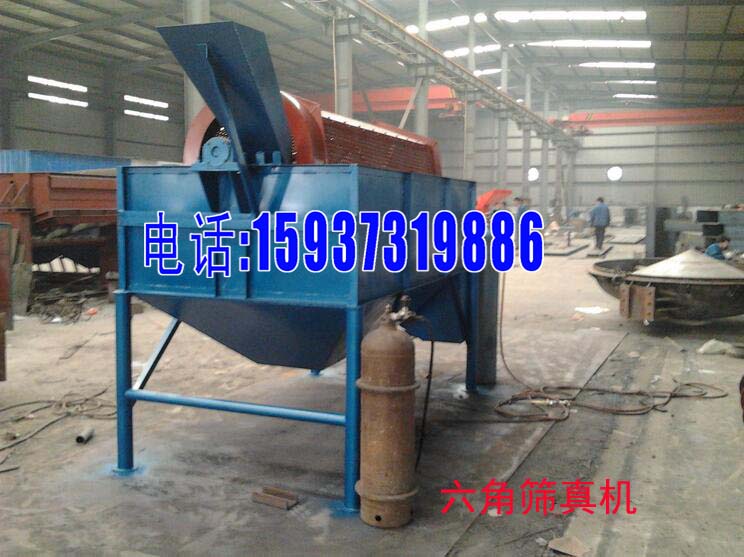高效六角回轉式滾筒篩是一種運動軌跡兼有拋物線運動和滑落運動的新型滾筒篩。一方面部分物料隨著簡體轉動被帶到一定高度作拋物線運動,另一方面其它物料隨筒體轉到一定的高度滑落。由于篩體被設計成六角形,被帶到一定高度的物料在拋落或滑落前的線速度是不同的(理論上)。由于線速度的變化,因此拋落或滑落運動的紊亂度進一步加大,從而有利于篩分效率的提高。物料在做上述運動的同時,由于篩體被設計成傾斜的,物料同時向前運動,因此有較強的向前輸送能力。六角回轉式滾筒篩的篩分效率較圓滾筒篩提高約25%。近年來,六角回轉式滾筒篩在篩分領域逐漸引起人們的重視。