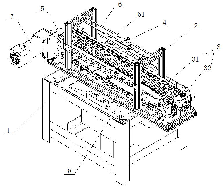1.機(jī)體底座 2.清洗機(jī)體 3.傳送機(jī)構(gòu) 31.傳送鏈條 32.驅(qū)動軸 4.清洗噴頭 5.收納槽 6.橫梁 61.滑槽 7.電機(jī) 8.廢液收集槽 9.磁性分離器