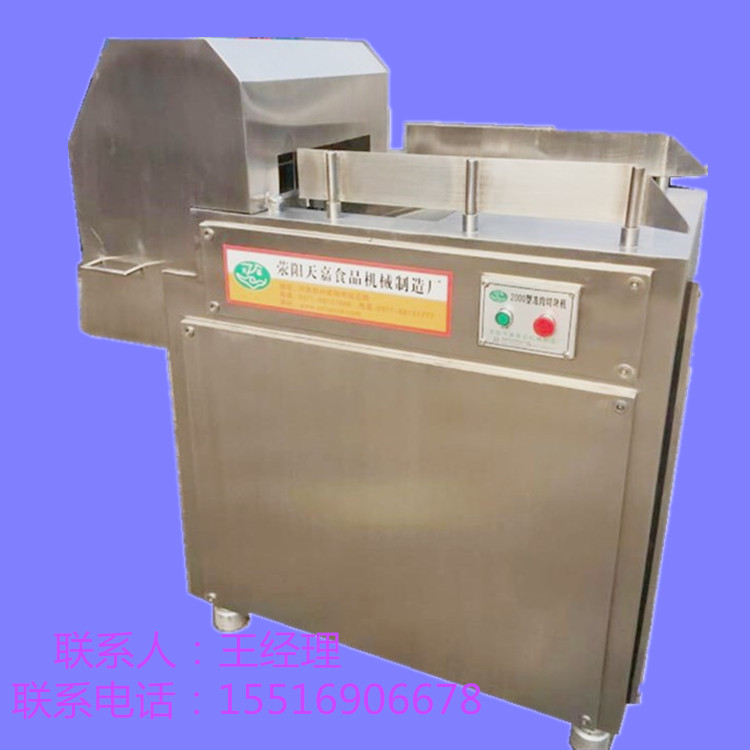 凍肉切塊機(jī)可直接切割未經(jīng)解凍的各類凍肉,減少了緩化的時(shí)間,避免了整塊肉在緩化過程中營(yíng)養(yǎng)成分的流失,是肉制品加工過程中必不可少的設(shè)備。本機(jī)吸取了國(guó)內(nèi)外 同類產(chǎn)品的先進(jìn)技術(shù),并結(jié)合我國(guó)實(shí)際加工工藝研制生產(chǎn)。具有性能穩(wěn)定,投入小,生產(chǎn)效率高。整機(jī)均采用優(yōu)質(zhì)不銹鋼制造,刀片采用優(yōu)質(zhì)合金制造,刀刃鋒利,切削 效果好。該機(jī)適用于多種肉類模塊凍肉切斷、分割,也適用于速凍湯圓中的速凍油的切割。生產(chǎn)過程無需解凍,可直接將凍肉塊切斷、分割,大大降低了用戶生產(chǎn)過程中 的制冷費(fèi)用,保證了肉質(zhì)不受二次污染和損耗,肉的營(yíng)養(yǎng)成分不會(huì)損失,味道鮮美。