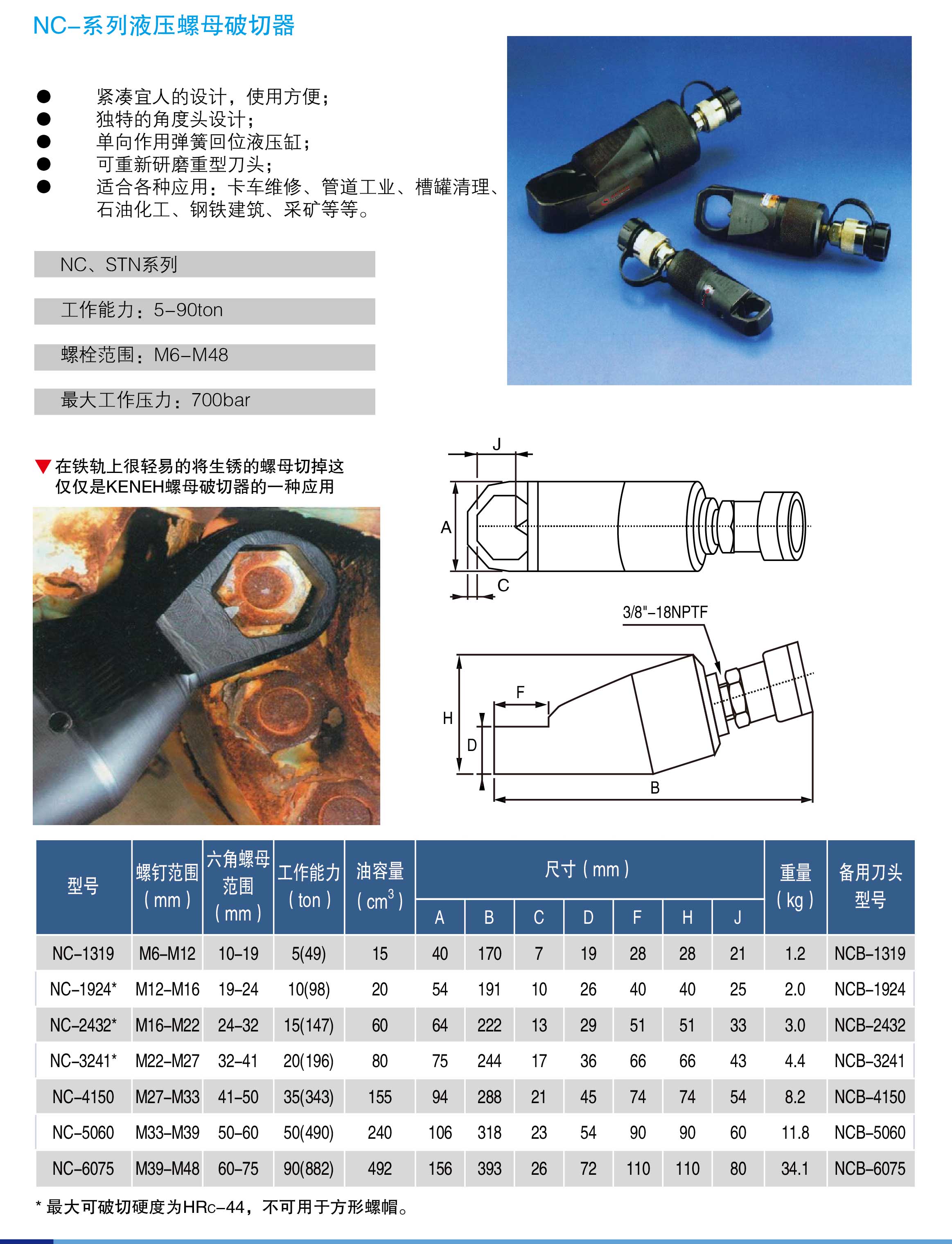 工業(yè)生產(chǎn)中廣泛使用的螺栓帽(螺母)在露天高溫或腐蝕性環(huán)境中,有的被銹蝕咬死,有的由于被砸碰而絲扣受損,總之,出現(xiàn)問題,要拆卸螺母是非常困難的,以往的做法通常是利用(氣)焊將螺帽和螺栓一齊割掉,然而在一些特殊工況環(huán)境中,有時嚴(yán)禁動用火(電)焊操作,如發(fā)電廠的煤粉 倉、油管道高壓高溫管路等處,要更換螺母螺栓就更讓人束手無策,液壓螺母破切器可以不動火、不用電,不損傷螺栓絲扣,簡便、快捷、安 全、高效地解決螺栓螺母的拆卸和更換難題。