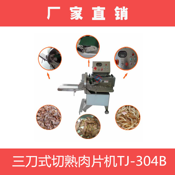 三刀式高效切熟肉機(jī)tj-304b,出料口帶輸送帶此機(jī)是本公司自行研發(fā)、設(shè)計(jì)的一款切熟肉機(jī)器,采用特制的三把刀片能將叉燒肉、鹵味、豬頭皮、豬耳朵、牛肚、肥腸、牛肉等熟肉切成條、片狀,出料口連接輸送帶,使得切出來的物料擺放整齊,無需排列可直接裝入托盤。適用快餐業(yè),超市,大型食堂,食品行業(yè)使用。