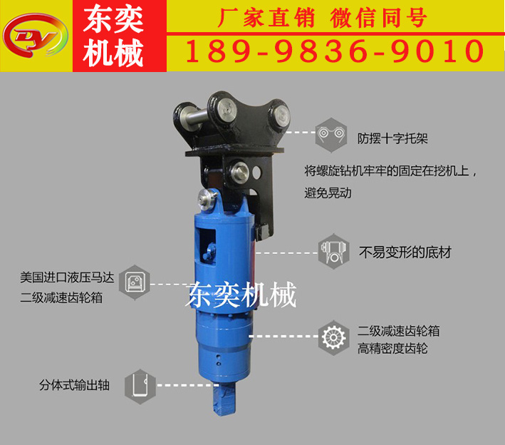 挖掘機螺旋鉆機安 裝拆卸方便。挖掘機小臂不用拆卸,直接類似掛破碎錘一樣,管路系統(tǒng)都可以共用,真正實現(xiàn)一機三用——挖、破、鉆。拆卸時間和換斗時差不多。左右有擺動角度36°。當挖掘機在工地不平坦的情況下,挖機手可根據(jù)位置不同調(diào)整鉆桿角度,保持90°垂直下鉆,而挖改則不能調(diào)整,挖掘機是斜的就只能鉆斜孔。 作業(yè)半徑大。因為小臂不拆,它的作業(yè)半徑至少可以比挖改延長作業(yè)半徑2-3米,且平打孔、仰角打孔、豎打孔都可以實現(xiàn)。我們螺旋鉆機可以根據(jù)不同配車進行改裝,只要您提供對應(yīng)的配車我們給到您合適的方案可以進行改裝,產(chǎn)品內(nèi)部給您做一個簡單介紹,動力機頭內(nèi)部采用引進的是美國進口的馬達提供足夠動力,同時機頭也是我們的核心產(chǎn)品,齒輪箱采用兩層變速齒輪提供動力變速,確保齒輪正常運轉(zhuǎn),大大增加適用性,解決全球不同地方不同土質(zhì)的施工現(xiàn)場,輸出軸承采用非移位軸,確保樁孔精度和使用壽命.托架介紹:起移動托舉的作用,在施工過程中避免不良操作震動帶給機身損害,以上為螺旋鉆機部分介紹,如果有疑問,歡迎來電咨詢。螺旋鉆機采用挖掘機,裝載機,鏟車,鉤機作為動力適用于種樹挖坑、電線桿坑鉆孔、鉆孔直徑徑范圍為:200mm-1200mm。適用于直接鉆孔立桿的工程,也適用于在坑中下卡盤的鉆孔工程。該機同時適用太陽能光伏發(fā)電中支架安 裝時的鉆孔工程,將鉆桿卸下后安 裝特定連接頭可直接用于螺旋樁的安 裝。同時該機也被稱作為打樁機,在農(nóng)村房屋改造工程中,該機可以用于樁基的鉆孔。該機充分實現(xiàn)了一機多用的功能,大大提高了實用性。螺旋鉆機,主要由驅(qū)動頭和鉆頭組件構(gòu)成,驅(qū)動頭與鉆頭組件固定連接,鉆頭組件包括鉆桿、包繞著鉆桿的螺旋葉片、以及設(shè)置在鉆桿末端的鉆頭,所述的螺旋葉片的底端設(shè)置有鉆齒。