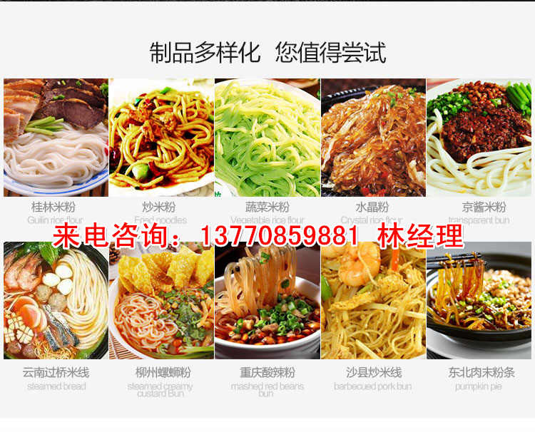 各種面條、雜糧面條、彩色面條以及以紅薯、玉米、大豆、蠶豆等制成淀粉 為原料的等多種食品而且每種食品厚薄、粗細等規(guī)格可根據(jù)需要任意調(diào)整。