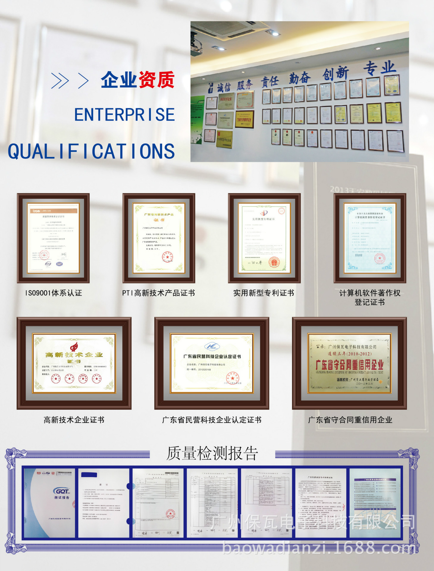 廣州保瓦電子科技有限公司--廣東省高新技術(shù)企業(yè)--廣東省守合同重信用企業(yè)--廣東省民營(yíng)科技企業(yè)--慧聰網(wǎng)2013電氣行業(yè)十大新銳企業(yè)--通過(guò)歐盟ce認(rèn)證、三星九千認(rèn)證--擁有3個(gè)商標(biāo)注冊(cè)、3項(xiàng)廣東省高新技術(shù)產(chǎn)品證書(shū)、4項(xiàng)實(shí)用新型專(zhuān)利證書(shū)、9個(gè)保瓦計(jì)算機(jī)軟件著作權(quán)登記證書(shū)