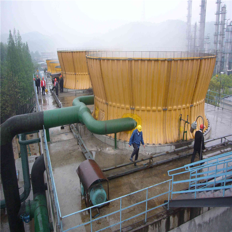 圓形玻璃鋼冷卻塔主體采用全鋼結構,玻璃鋼板圍護,塔體設檢修扶梯供塔頂設備的正常維護管理。填料采用優(yōu)質(zhì)的pvc斜梯波片,以擴散淋水面積;通過固定噴淋布水方式,實現(xiàn)布水均勻,增強冷卻效果,使其運行更加可靠、耐用、裝配更方便。