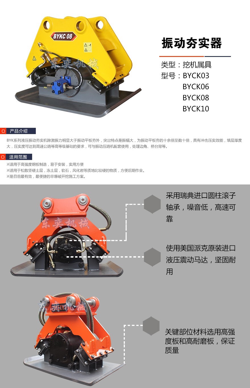 挖掘機(jī)振動(dòng)夯廣泛的應(yīng)用于斜坡面道路,建筑物基礎(chǔ)工程,堤壩斜面,排水渠泥土石子等的夯壓工作。且具有故障低,保養(yǎng)簡(jiǎn)單,安 裝方便,磨損小適合多樣工作等特點(diǎn),且采用特殊震動(dòng)板,能有效保護(hù)挖掘機(jī)的機(jī)臂。詳細(xì)介紹:跳動(dòng)幅度大,沖擊力強(qiáng)。該產(chǎn)品設(shè)計(jì)合理,外形美觀,影響深度大,操作平穩(wěn),不留死角,效率高等優(yōu)點(diǎn)。廣泛用于公路市政建筑,水利等領(lǐng)域在修建路面,街道,樓房,水渠,橋梁時(shí)對(duì)工程基礎(chǔ),路緣瀝青路面的夯實(shí)。挖掘機(jī)振動(dòng)夯優(yōu)勢(shì)在于適合多地形作業(yè),河提護(hù)坡,溝槽凹坑壓實(shí),斜坡邊坡壓實(shí)處理,基坑回填土夯實(shí),邊角橋臺(tái)背等等壓路機(jī)不能工作的地方。與手持電動(dòng)平板或內(nèi)燃平板夯相比能大幅度降低勞動(dòng)強(qiáng)度,減低人工成本,明顯提高效率。因其頻率和振幅大數(shù)10倍,且具有沖擊壓實(shí)效能,故引響土層深度大,壓實(shí)度可與大噸位壓路機(jī)相當(dāng)。對(duì)堤壩壓實(shí)、渠道壓實(shí)、護(hù)坡壓實(shí)、深溝壓實(shí)均能獲滿意的壓實(shí)效果。埋管施工后的回填土壓實(shí)非常方便,明顯提高工程的效率和施工質(zhì)量。