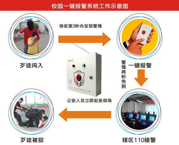 在學(xué)校門衛(wèi)室、校長(zhǎng)辦公室、宿舍、操場(chǎng)、食堂、各樓層樓梯口安 裝一鍵緊急按鈕,遇到緊急情況一按緊急按鈕即可通過(guò)無(wú)線信號(hào)傳輸?shù)綀?bào)警主機(jī),然后再由主機(jī)通過(guò)gprs/ip把警情立馬上傳到當(dāng)?shù)亟泳行摹V行耐瑫r(shí)還會(huì)顯示報(bào)警學(xué)校的名稱、位置公安 機(jī)關(guān)就可以第一時(shí)間接到報(bào)警,用最短時(shí)間到達(dá)現(xiàn)場(chǎng)。