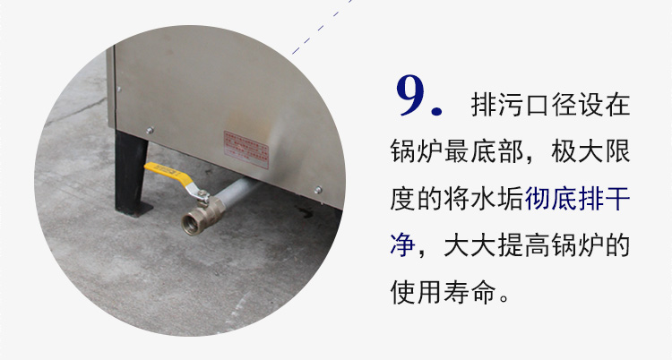 3、進(jìn)水口和排污口為同一口徑,減少爐膽結(jié)垢,增加使用壽命。