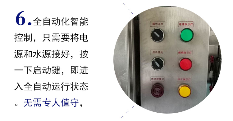 鍋爐操作系統(tǒng)為全自動(dòng)控制,所有的運(yùn)行狀態(tài)均可在液晶屏中一目了然。您可以在顯示屏中觀察到燃燒器工作狀態(tài),鍋爐水位狀態(tài),當(dāng)前溫度,給水泵運(yùn)行狀態(tài),故障報(bào)警狀態(tài)等,讓您隨時(shí)掌握鍋爐運(yùn)行狀況,使用更放心。傻瓜式一鍵控制,只需輕輕一按即可進(jìn)入全自動(dòng)運(yùn)行狀態(tài),所有安 全保護(hù)裝置均開始工作,無須專人值守,使操作人員更安 心、省心。