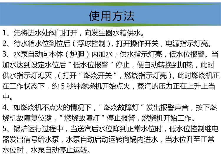 3)內(nèi)膽儲(chǔ)汽空間大,蒸汽純無(wú)水份,采用三極高,中,低探針控制水位。全自動(dòng)加水加熱,防止無(wú)水加熱現(xiàn)象,即安 全又延長(zhǎng)加熱管及鍋爐使用壽命