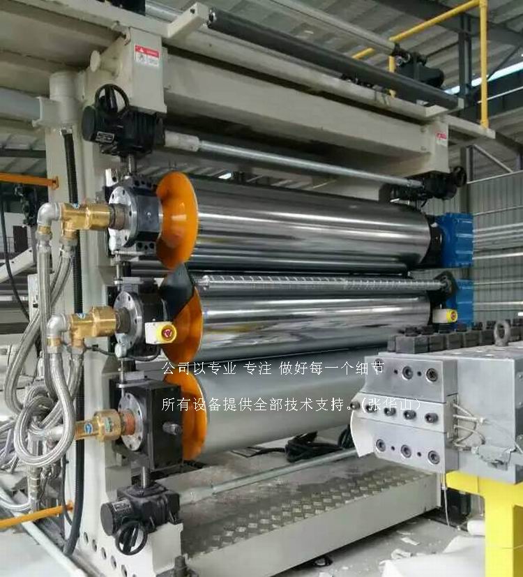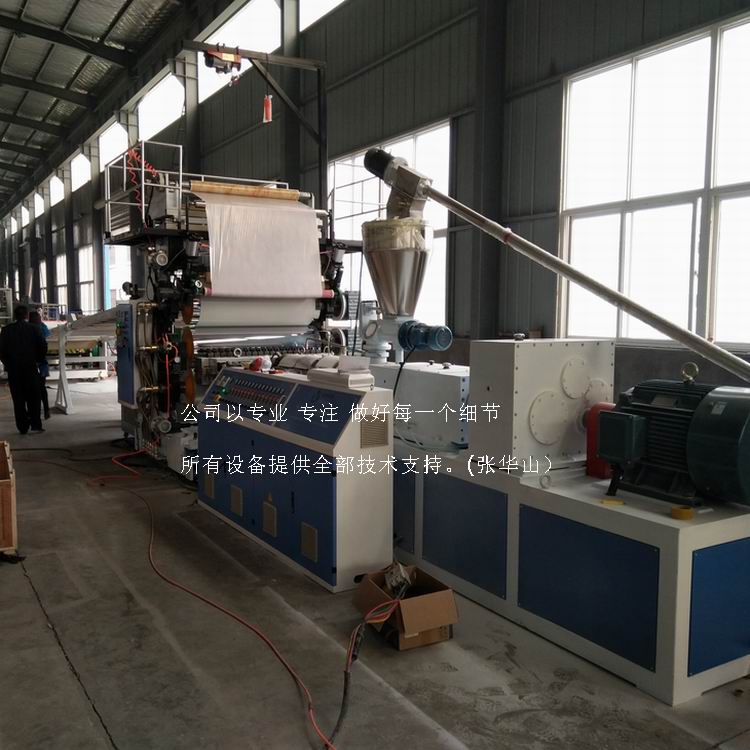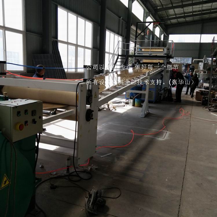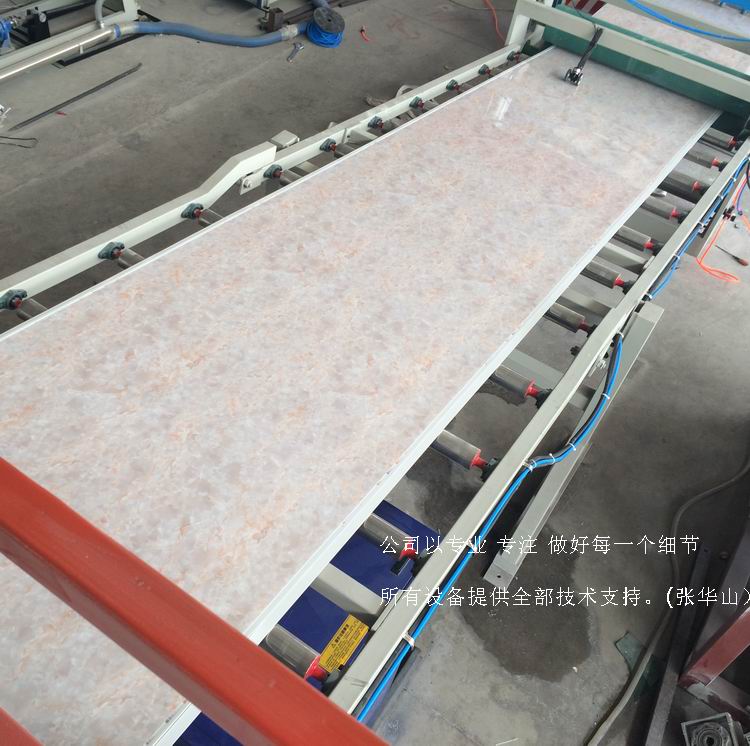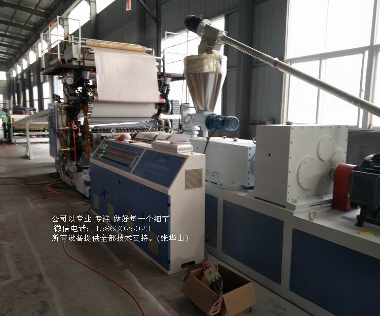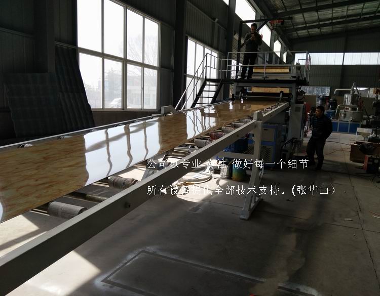 pvc仿大理石紋板材設(shè)備、pvc內(nèi)墻裝飾板生產(chǎn)設(shè)備由自動(dòng)上料進(jìn)入高速混料、再自動(dòng)上料到雙螺桿擠出機(jī)、由大板模具結(jié)構(gòu)出料進(jìn)行三輥定型模定型、排輥托冷裝置、裁邊裝置、牽引機(jī)、自動(dòng)切割機(jī)、排輥輸送機(jī)等組成。