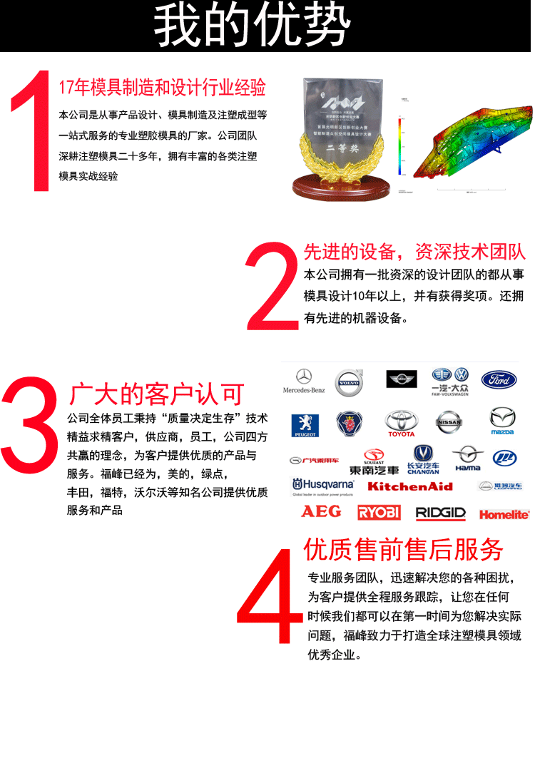 深圳市寶安區(qū)松崗福峰模具廠座落于深 圳市 寶安區(qū)松崗鎮(zhèn)譚頭第二工業(yè)區(qū)廠房8棟,是一 家專注塑膠模具行業(yè)15年的模具制造出,公 司 具備汽車模具,醫(yī)療設(shè)備模具,家電模 具,電 動(dòng)工具模具,雙色模具,包膠模具, 多種模具 設(shè)計(jì)與產(chǎn)品制造,機(jī)加工、CNC加 工、拋光、 電鍍等工藝一條龍的一站式生產(chǎn)廠家,公司不僅傭有精密的模具制造設(shè)備和壓鑄設(shè)備,還配備了各種...