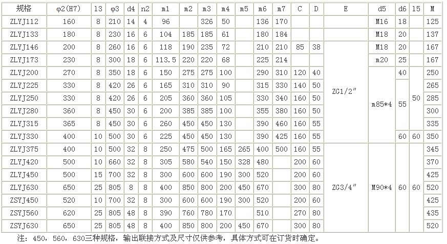 三、規(guī)格和理論的適配電機(jī)功率:zlyj133 可靠適配功率5.5-11kw 規(guī)格zlyj 140 可靠適配功率7.5-13kw 規(guī)格zlyj 146 可靠適配功率11-15kw 規(guī)格zlyj 173 可靠適配功率15-22kw 規(guī)格zlyj 180 可靠適配功率18-30kw 規(guī)格zlyj 200 可靠適配功率22-45kw 規(guī)格zlyj 225 可靠適配功率30-55kw 規(guī)格zlyj 250 可靠適配功率45-75kw 規(guī)格zlyj 280 可靠適配功率55-90kw 規(guī)格zlyj 315 可靠功率75-130kw 規(guī)格zlyj 330 可靠功率110-160kw規(guī)格zlyj375 可靠功率130-200kw規(guī)格zlyj420 可靠功率200-260kw,以上功率僅供客戶參考,以客戶實(shí)際為準(zhǔn)。