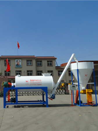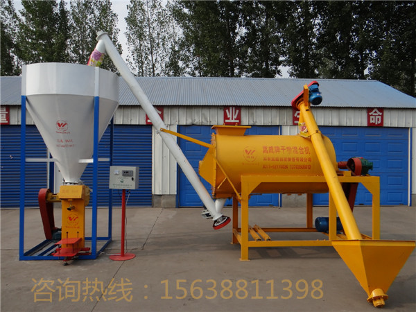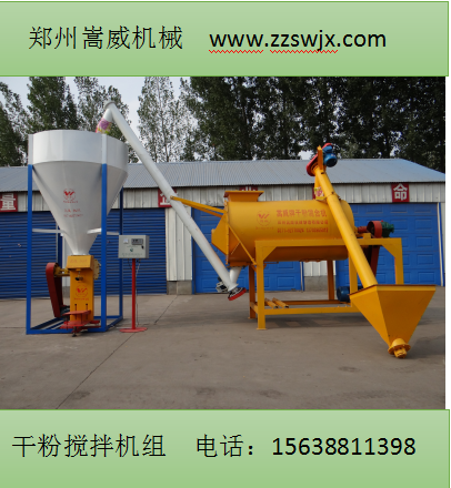 嵩威牌swjx-2混合機(jī)組由上料絞龍、混合機(jī)、提升絞龍、臥式儲(chǔ)料倉(cāng)、稱重裝袋機(jī)、空氣壓縮機(jī)、控制柜等組成。上料絞龍用于給混合機(jī)上料,提升絞龍可將混合后的成品料提升到儲(chǔ)料倉(cāng)。臥式儲(chǔ)料倉(cāng)底部有攪拌螺帶軸,用于防止物料結(jié)拱,同時(shí)可將物料輸送到裝袋機(jī)。儲(chǔ)料倉(cāng)下方可裝兩臺(tái)稱重裝袋機(jī),用于成品包裝。
