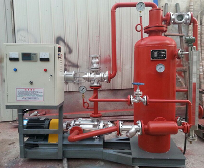一個蒸汽回收裝置系統(tǒng)設(shè)計的成敗關(guān)鍵取決于蒸汽回收機是否能有較高的冷凝水回收率,并能充分利用冷凝水的熱量以及系統(tǒng)運行是否穩(wěn)定可靠。蒸汽回收裝置在運行時,冷凝水從用熱設(shè)備排出,經(jīng)疏水器進入蒸汽回收機。蒸汽回收機由閃蒸罐、除污器、冷凝水快排裝置,壓力平衡裝置、汽蝕消除器、蓄水箱、液位變送傳感器等組成。