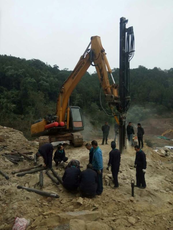 ④ 即可旋轉(zhuǎn)也可沖擊,且對付各種巖石。此機(jī)留有大風(fēng)量氣管接口,如石頭較軟要求只旋轉(zhuǎn)不沖擊,而且鉆孔深度3m之內(nèi),可采用挖掘機(jī)自帶的空壓機(jī),3個立方左右,只提供排雜。如石頭較硬必須要旋轉(zhuǎn)也要沖擊,而且鉆孔深度超過3m,那么可采用備用氣管接口外接一個10立方左右的空壓機(jī)(此臺空壓機(jī)可購買可租)來提供風(fēng)量