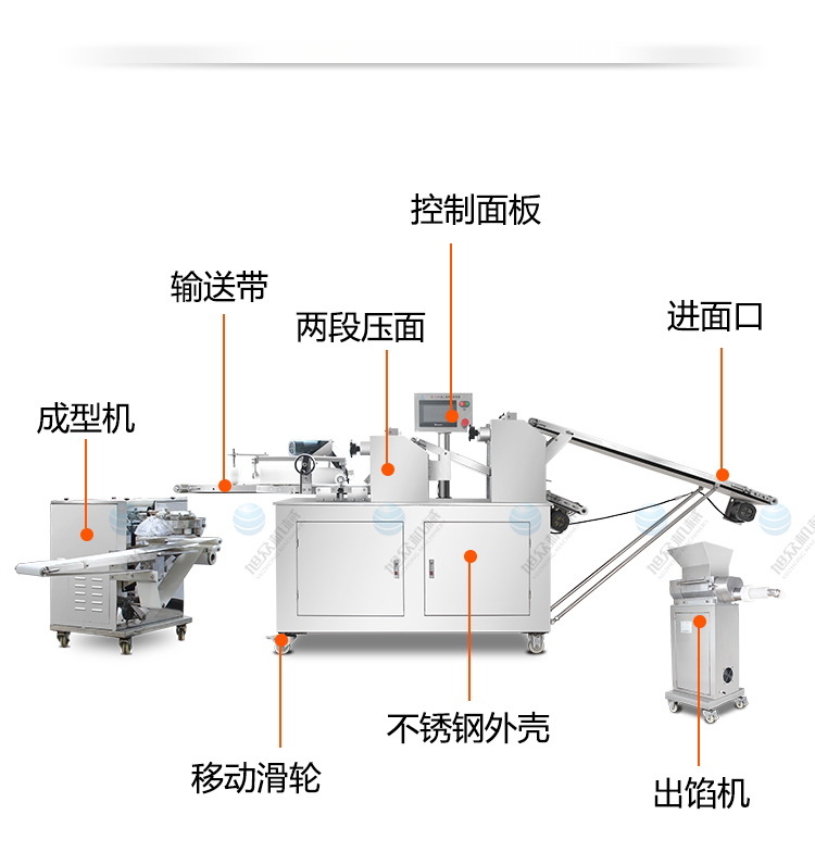 二段酥餅機(jī)是經(jīng)一段、二段壓面輪將面皮壓成合適厚度,由自動(dòng)出餡機(jī)將餡料充填至皮上,經(jīng)卷面輪將面皮卷成圓柱狀,最后以成型刀具切割成球狀,或是長條狀餅胚,在經(jīng)過打餅成形,整個(gè)成型過程不會(huì)破壞面皮筋性,完全保持手工原味。 生產(chǎn)速度,制品大小、重量、比餡比例、可隨時(shí)調(diào)整、變更。 適用于生產(chǎn)酥餅類:酥式月餅、綠豆餅、蔥油餅等。面包類:奶油面包、豆沙面包、奶黃面包等。