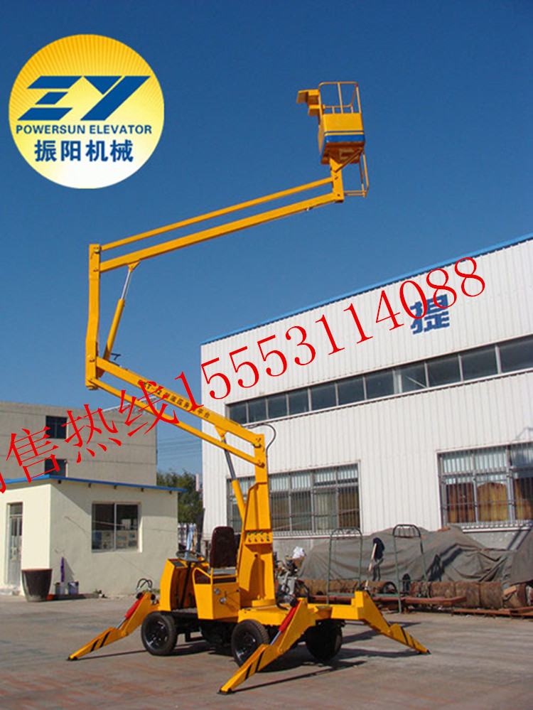 牽引曲臂式高空作業(yè)平臺(tái):移動(dòng)方便,曲臂結(jié)構(gòu)緊湊.采用新型優(yōu)質(zhì)型鋼,強(qiáng)度高,重量輕,直接接入交流電或采用車自身動(dòng)力啟動(dòng),架設(shè)速度快,具有伸縮臂,工作臺(tái)曲臂式高空作業(yè)升降車能懸伸作業(yè)、跨越一定的障礙或在一處升降可進(jìn)行多點(diǎn)作業(yè);http:/ 平臺(tái)載重量大,可供兩人或多人同時(shí)作業(yè)并可搭載一定的設(shè)備;升降平臺(tái)移動(dòng)性好,轉(zhuǎn)移場(chǎng)地方便;外型美觀,適于室內(nèi)外作業(yè)和存放。適用于既可升高又可延伸,還可360度旋轉(zhuǎn),易于跨越障礙物到達(dá)工作位置,是理想的高空作業(yè)設(shè)備.