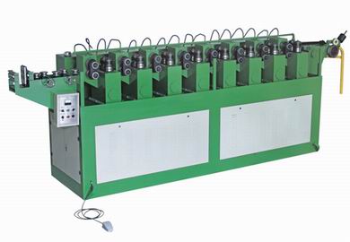 在機(jī)體上平行排列著的多個(gè)軋輥箱,每個(gè)軋輥箱上有縱向和橫向的兩對(duì)軋輥,兩對(duì)軋輥軋分別為水平和垂直分布,經(jīng)輥軋后的線徑是按比例逐漸縮少的,壓縮率是根據(jù)照材料延伸特性設(shè)計(jì)的,每道次的壓縮都是等值的,當(dāng)線材經(jīng)過(guò)軋輥時(shí),材料被旋轉(zhuǎn)的輥軋輥壓,壓小后的線材從軋輥中擠出,最后經(jīng)牽引裝置把線材輸送到收料盤(pán)內(nèi),實(shí)現(xiàn)線材的輥軋。