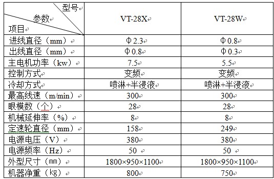 本機器采用德國拉絲技術(shù)開發(fā)出來的機型,設(shè)計為臥式結(jié)構(gòu),動力由一個主電機通過鏈條傳動于各塔輪軸上。圓錫線經(jīng)過放線架進入拉伸室,通過塔輪、拉絲模具進行拉伸。線材拉伸時的冷卻方式是采用噴淋和半浸泡方式。然后依次經(jīng)過定速輪再經(jīng)過牽引輪后,進入收線盤。拉伸塔輪采用單列水平排列。