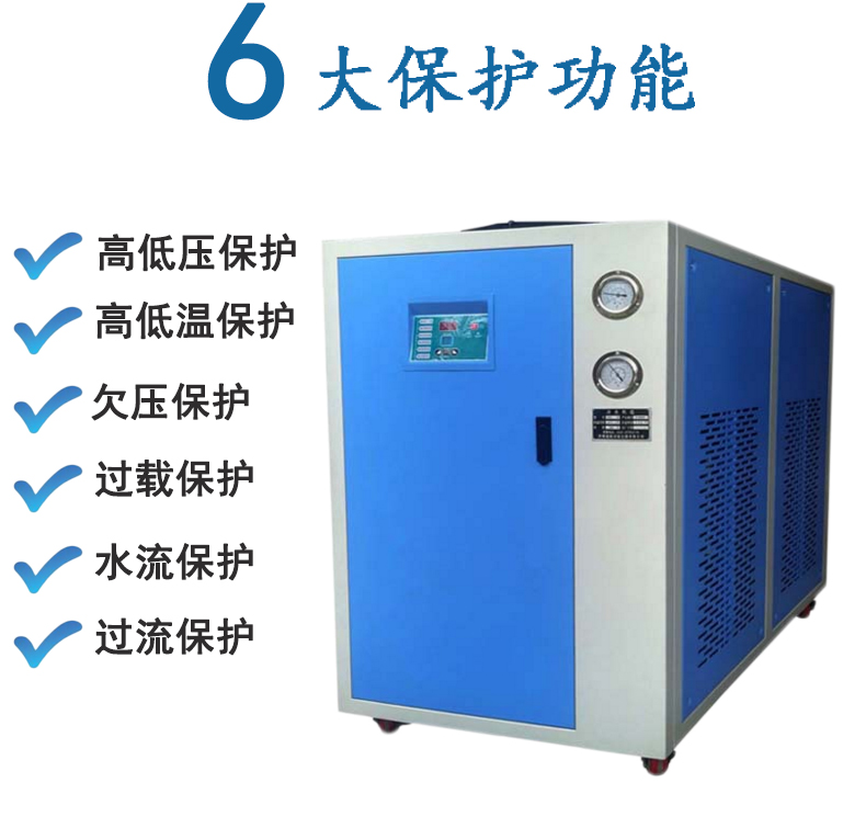 1冷水機,通過自身吸入冷空氣,排出熱空氣,散熱無需外接散熱塔,安 裝、移動方便。主機采用歐美日進口名牌壓縮機,內(nèi)置安 全保護,運行可靠,效率高,噪音低,省電耐用,使用壽命長。