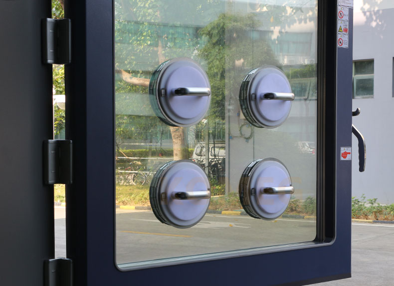在大門上安 裝一套460×560mm(寬×高)觀察窗,多層中空電熱鍍膜玻璃可以有效保溫,并防止結(jié)露。