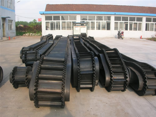 波狀擋邊輸送帶由基帶、擋邊、橫隔板3部分組成。擋邊起防止物料測滑撒落的作用。為便于繞過滾筒,檔邊設(shè)計成波紋狀;波狀擋邊輸送帶橫隔板的作用是承托物料,為了實現(xiàn)大傾角輸送,采用t型tc型。波狀擋邊輸送帶檔邊和橫隔板是用二次硫化的方法與基帶連接的,具有很高的連接強度