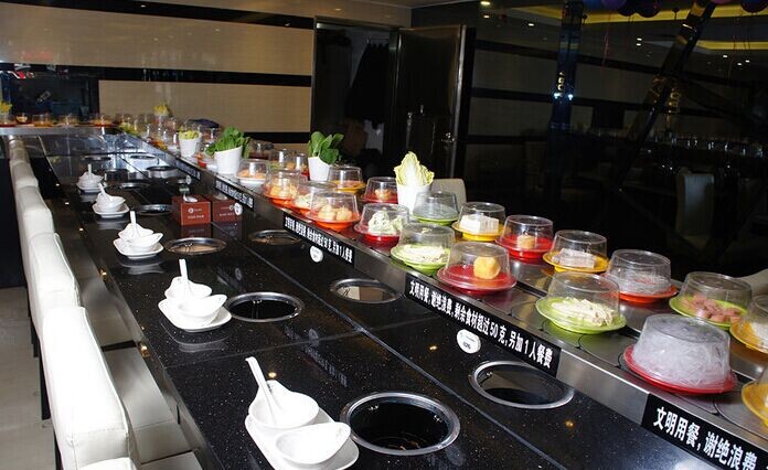 5、回轉(zhuǎn)火鍋傳送設(shè)備可以讓客人清楚選擇各種菜品,而不再只是看不到實(shí)際菜品的菜單。