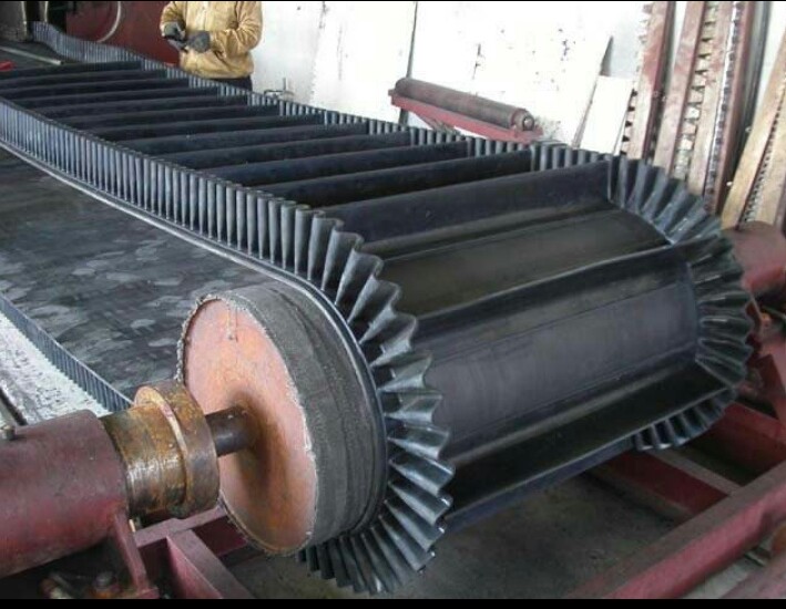波狀擋邊輸送帶中以大傾角波狀擋邊輸送帶最有名,大傾角波狀擋邊輸送帶又叫裙邊隔板輸送帶,是由基帶、擋邊、橫隔板3部分組成。擋邊起防止物料測滑撒落的作用。為便于繞過滾筒,檔邊設(shè)計成波紋狀;橫隔板的作用是承托物料,為了實現(xiàn)大傾角輸送,采用t型tc型。檔邊和橫隔板是用二次硫化的方法與基帶連接的,具有很高的連接強度。用于輸送易散落的粉 狀、粒狀、小塊狀、糊狀及液態(tài)狀物料。