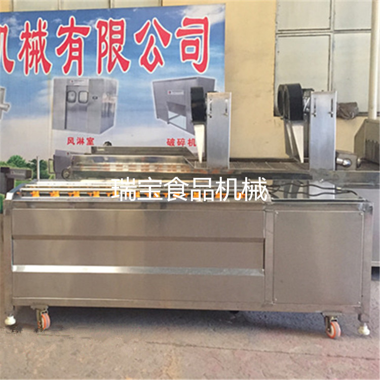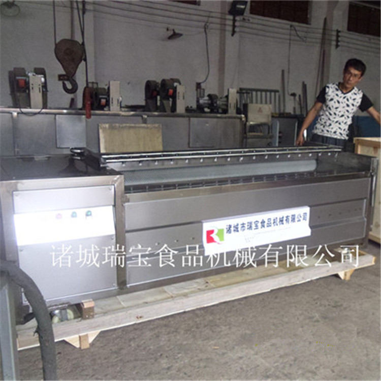 利用毛輥的轉(zhuǎn)動來去掉附著在蔬菜上的泥土(用毛輥絲較硬的毛輥可直接去皮),大型毛刷去皮機上部設(shè)有噴淋水管,毛刷清洗去皮機可對物料進(jìn)行噴淋沖洗。每隔一定時間,打開清洗去皮機設(shè)備端部出料口,物料排除設(shè)備。
