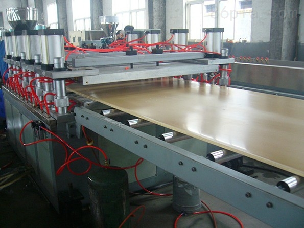 木塑建筑模板生產(chǎn)線由錐形雙螺桿擠出機(jī),板材模具,真空定型和輥軸牽引