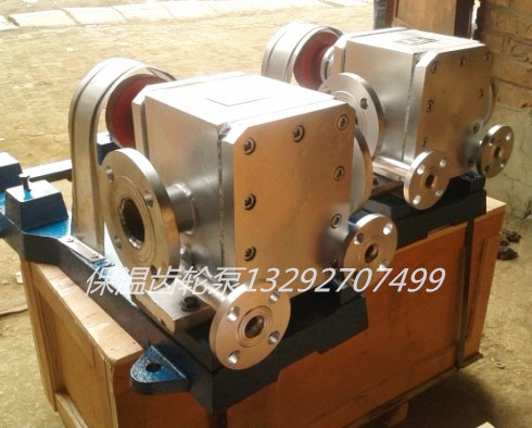 泵體兩平行面上兩孔內(nèi)裝入一對(duì)齒輪和四個(gè)軸承座,前后安 裝前蓋和后蓋,兩側(cè)法蘭供用戶連接管路使用,泵體頂部?jī)陕菁y孔供用戶連接保溫介質(zhì)對(duì)泵腔進(jìn)行保溫。