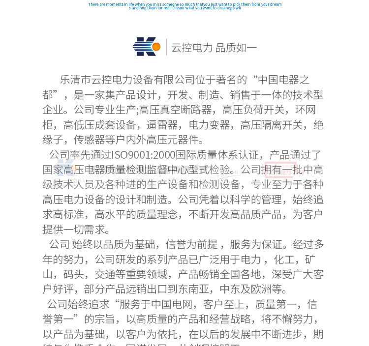 樂清市云控電力設(shè)備有限公司位于著名的“中國電器之都”,是一家集產(chǎn)品設(shè)計,開發(fā)、制造、銷售于一體的技術(shù)型企業(yè)。公司專業(yè)生產(chǎn);高壓真空斷路器,高壓負荷開關(guān),環(huán)網(wǎng)柜,高低壓成套設(shè)備,避雷器,電力變器,高壓隔離開關(guān),絕緣子,傳感器等戶內(nèi)外高壓元器件。