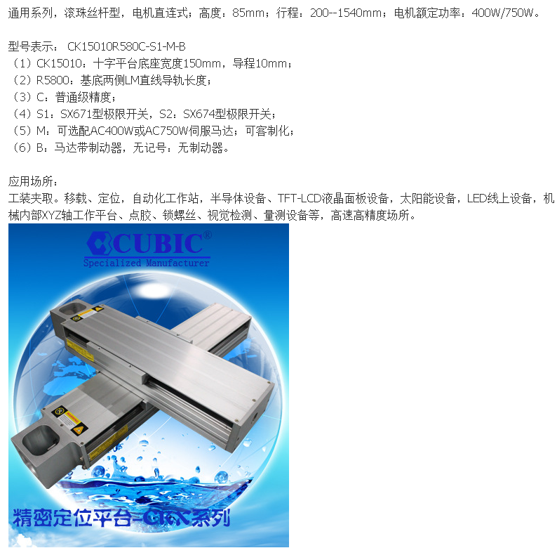 cubic精密定位平臺(tái)cs系列為馬達(dá)驅(qū)動(dòng)之單一復(fù)合件,行程從60mm 到2000mm,模組化之設(shè)計(jì)能組合出尺寸非常豐富之單軸或雙軸之定位滑臺(tái),依不同定位精度需求,可搭配不同精度等級(jí)之滾珠螺桿及線性滑軌,組合出各種精度之線性滑臺(tái)。由它們搭配成的雙軸規(guī)格的滑動(dòng)臺(tái)也已系列化。適合用作負(fù)荷負(fù)載大、行程較長(zhǎng)部位的高精密定位機(jī)構(gòu)上。