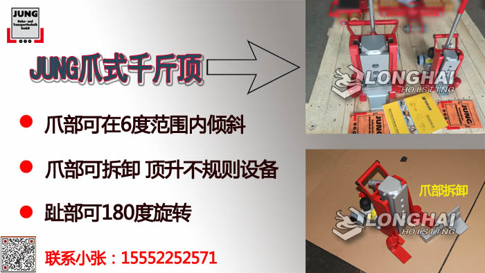 進口爪式千斤頂jh6gplus 江蘇爪式千斤頂 爪式千斤頂型號【德國jung高端品牌 保質(zhì)5年】jung爪式千斤頂屬于德國jung高端品牌原裝產(chǎn)品,龍海起重為其代理商,可提供代理證明,此款千斤頂爪部可拆卸,也可在6度范圍內(nèi)傾斜正常頂升重物,且趾部可以180度旋轉(zhuǎn)。