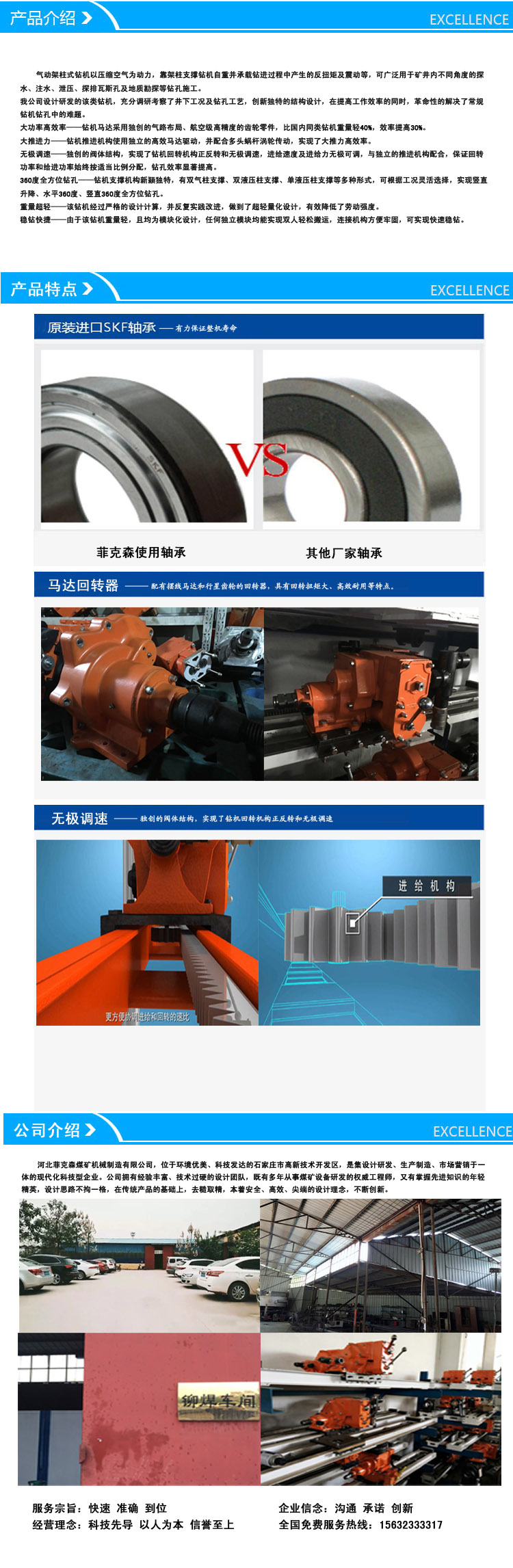 氣動(dòng)架柱式鉆機(jī)以壓縮空氣為動(dòng)力,靠架柱支撐鉆機(jī)自重并承載鉆進(jìn)過程中產(chǎn)生的反扭矩及震動(dòng)等,可廣泛用于礦井內(nèi)不同角度的探水、注水、泄壓、探排瓦斯孔及地質(zhì)勘探等鉆孔施工。