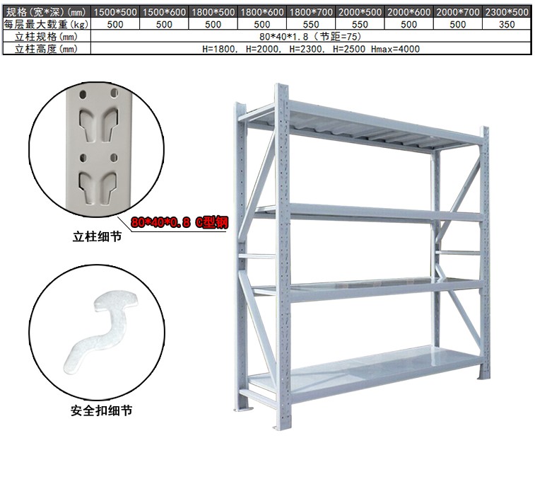 中型貨架特點(diǎn) 1、全組裝式結(jié)構(gòu),隨意組合,安 裝、拆卸方便靈活。2、立柱為裝配式結(jié)構(gòu),橫梁與立柱之間采用鋼扣卡插連接,并設(shè)以安 全匙鎖定,防止脫落。3、貨架材料截面優(yōu)化,多種管材選擇,提高承截力。4、貨架立柱是由冷軋鋼板經(jīng)專用冷彎成型機(jī)組滾軋成型,立柱正面沖雙排孔,立柱設(shè)有每75mm調(diào)節(jié)孔距,可根據(jù)貨物高低任意調(diào)節(jié)。5、采用蝴蝶孔更加美觀大方。6、貨架各部件加工好成型之后全部經(jīng)打磨、酸 洗、磷化、全自動(dòng)粉 末靜電噴涂、烘干等工藝處理后組裝成品。生產(chǎn)出的貨架成品表面光潔、美觀;貨架層可上下依75mm節(jié)距任意調(diào)節(jié),拆裝方便。7、相鄰背靠方向立柱之間可采用隔撐加強(qiáng)連接,立柱底部與地面可配合地釘使用,提高安 全及可靠性。