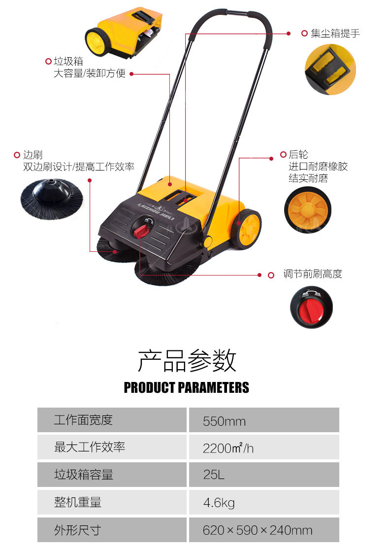 jl550掃地機(jī)是jl750掃地機(jī)的瘦身設(shè)計(jì),其工作原理、功能特點(diǎn)等除具jl750掃地機(jī)的全部?jī)?yōu)點(diǎn)外。還有小巧輕便、轉(zhuǎn)動(dòng)靈活的特點(diǎn),為廳堂、店鋪以及狹窄場(chǎng)地的清掃提供了工具。jl550產(chǎn)品結(jié)構(gòu)簡(jiǎn)單,方便靈活,重量輕,可掛在墻上存儲(chǔ),節(jié)省空間。jl550掃地機(jī)已廣泛應(yīng)用于學(xué)校、居民小區(qū)、公園、街道等場(chǎng)所,可清掃如:紙屑、煙蒂、落葉、顆粒物等垃圾,是您理想的清掃工具。