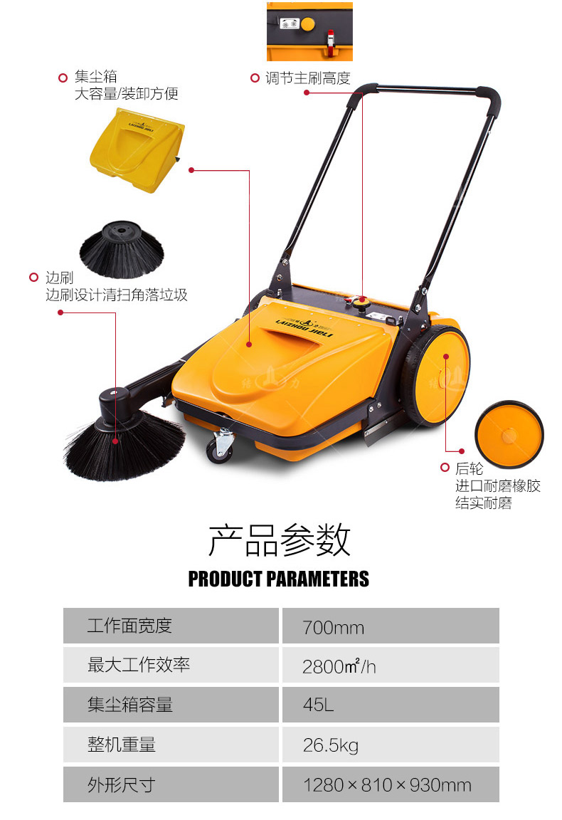jl700掃地機(jī)在現(xiàn)有無(wú)動(dòng)力掃地機(jī)自然除塵排氣的基礎(chǔ)上,增加了機(jī)械除塵裝置,將掃地機(jī)工作時(shí)垃圾箱內(nèi)形成的粉 塵氣體強(qiáng)制過(guò)濾排除箱外,還有效解除了粉 塵溢出的二次污染問(wèn)題。廣泛應(yīng)用于車間、廠區(qū)、倉(cāng)庫(kù)、公園、街道、居民小區(qū)等場(chǎng)所,可清掃如:粉 塵、樹(shù)葉、紙屑、煙蒂等垃圾。