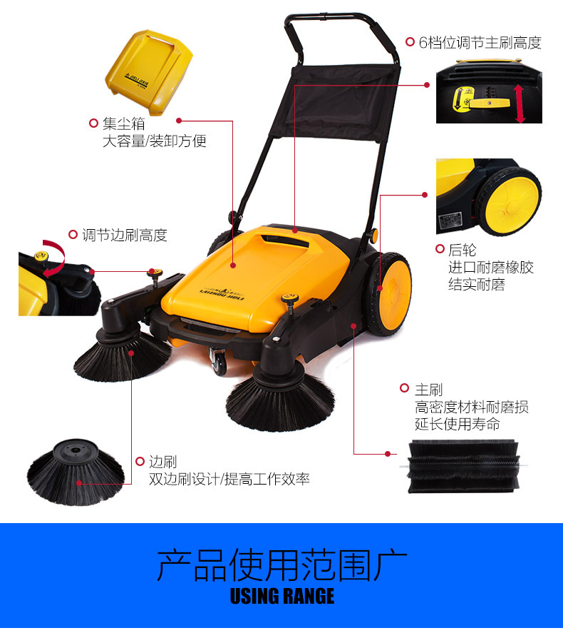 廠家直銷 手推式無(wú)動(dòng)力掃地機(jī) 清掃面積大 適合各種地面 可以快速清掃粉 塵、顆粒狀垃圾,已被街道、工廠、學(xué)校、公園等廣泛使用 。該機(jī)前端兩個(gè)轉(zhuǎn)刷可將路邊、墻角的垃圾旋轉(zhuǎn)撥出,限度的將垃圾收攏集中,然后通過(guò)后刷的滾動(dòng)撥掃將垃圾干凈的收入箱內(nèi)。