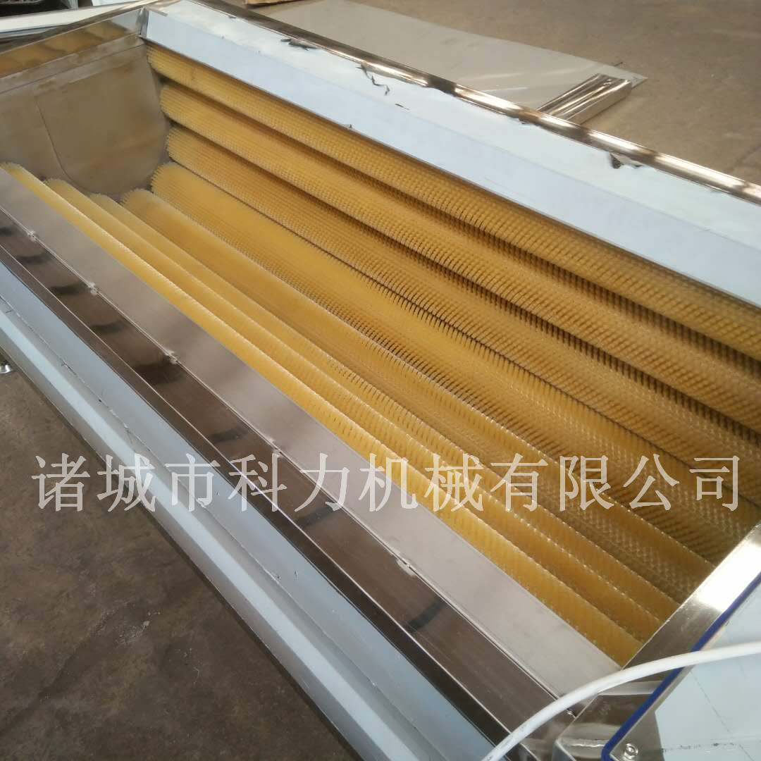 當原料放入該機后,毛刷輥旋轉(zhuǎn)刷洗原料并使其不斷翻轉(zhuǎn),同時,排水管不斷地噴淋,把從原料上刷洗下來的污物沖洗掉,直到洗凈為止,順著毛輥的旋轉(zhuǎn)方向出料。