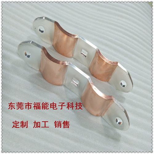 材料:采用優(yōu)質(zhì)0.05-0.3mm厚銅箔,常規(guī)使用0.1厚t2紫銅箔,上下表面貼0.1厚純鎳片,或0.1厚鍍鎳銅片,將疊片部分壓在一起,兩端或者打孔部分采用高分子擴散焊,通過大電流加熱壓焊成型。中間套熱縮管保護,大尺寸異形產(chǎn)品,中間采用浸塑工藝。