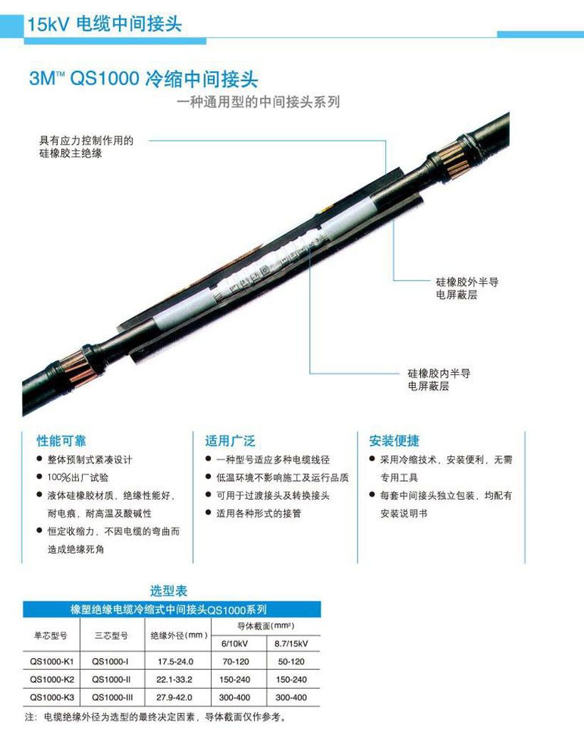 3m 冷縮中間接頭采用獨特的預(yù)擴張技術(shù), 使得一種型號適應(yīng)多種電纜線徑, 對電纜線徑兼容性強。冷縮電纜中間頭從結(jié)構(gòu)上講,為整體預(yù)制式緊湊設(shè)計,內(nèi)、電應(yīng)力控制、絕緣及外一體化。到目前為止,3m公司已擁有35kv及以下冷縮電纜中間接頭完整系列,適合聚乙烯電纜、交聯(lián)聚乙烯電纜和乙丙橡膠電纜等不同種類絕緣形式的電纜,可應(yīng)用于電纜橋架, 直埋, 架空等場合。硅橡膠材料本身決定了冷縮中間接頭具有相當(dāng)大的使用溫度范圍。